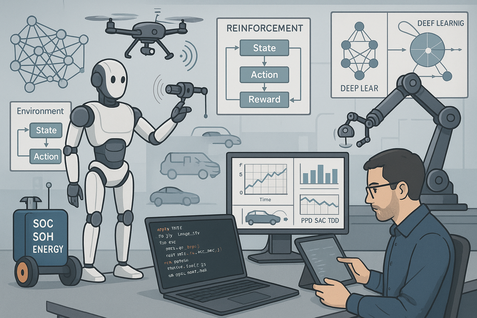 As a Ph.D. graduate from Carleton University and a member of the Intelligent Robotic and Energy Systems (IRES) Research Group, I led several research initiatives applying RL and DL techniques to real-world control challenges. My contributions include designing multi-agent reinforcement learning architectures, building CNN-LSTM models for predictive control, and implementing advanced state estimation techniques for hybrid energy storage systems.